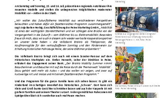 Peine, 09. Juli 2023. Die Vielseitigkeit der modernen Mobilität können Besucher bei der zweiten Auflage des BraWo Mobility Summer´23 erleben. Peine Marketing und die Volksbank BraWo laden für den 15. und 16. Juli 2023, zu einem Mobilitätswochenende ein - und haben ein buntes Programm für die ganze Familie aufgelegt. Begleitet wird dies von einem verkaufsoffenen Sonntag.